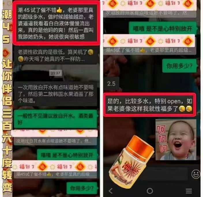 服用後全身發熱,性|慾|亢|奮,心情愉悅,思維活躍,個人防線放開,是理想的催||情助|性|產品,因為產品成分完全不屬於毒||品,所以更不用擔心警|察的檢查,是去娛樂場所的必備產品。