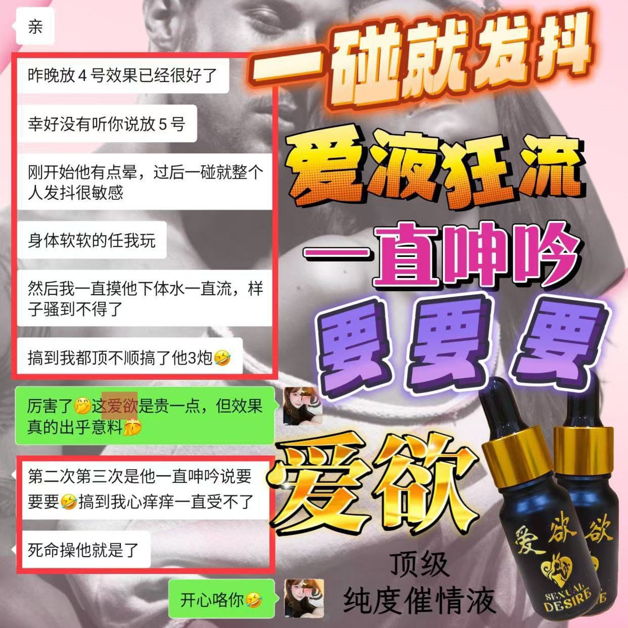 女性饮用数分锺後迅速见效,粉面微红、呼吸急促、氟息灼热、目露渴望、浑身燥热,此时的女性热情奔放,阴道内发痒,急需与你爱爱而不能自拔😇